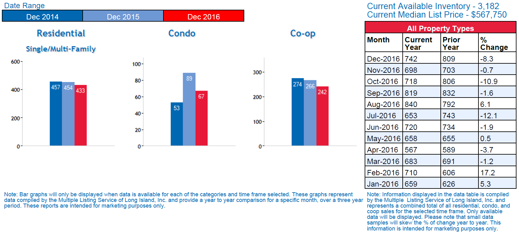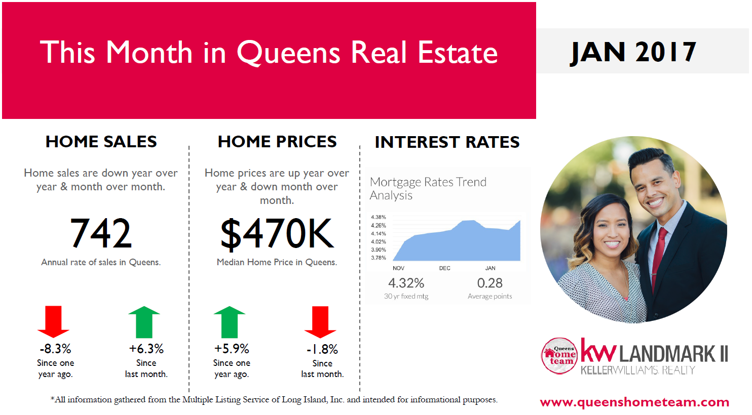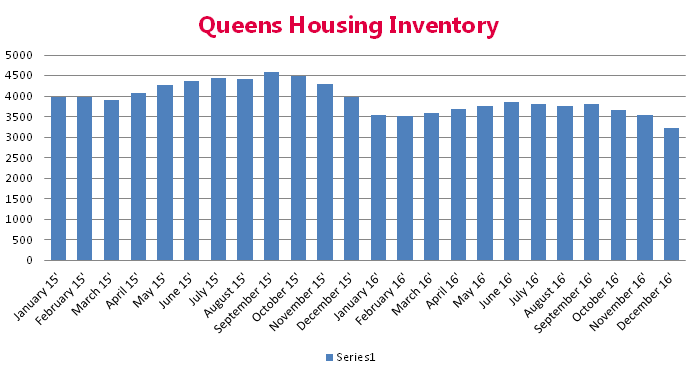 There was a 4.3-month supply of Queens housing inventory in December, which was a 4.4 percent decrease from November. The total number of homes for sale decreased by 8.5 percent compared to December of last year. It will be really important to track the inventory as we move in to the spring season and as interest rates rise further. Inventory and rates can be the driving factor in what 2017 looks like for the Queens real estate market.