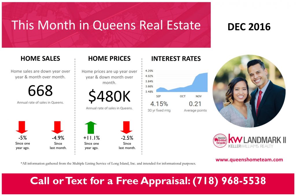 Home sales in the US increased significantly, and they actually reached their highest levels in nearly a decade. In Queens however, home sales actually dropped and have continued to decline over the last 4 months and for most of this year. This stark difference is a clear sign that what the rest of the country is seeing is not exactly what we’re seeing here in Queens. Either way, as the economy shows signs of expansion, coupled with continued low mortgage rates, buyers are entering the market despite diminished inventory levels. The main shift we’re seeing right now as we head into the new year, are the increasing mortgage rates. Although still historically low, people do tend to freak out when rates go up. We’ve already started getting calls from buyers who are looking to buy before rates go up again so the urgency will likely be apparent in the first quarter of 2017. As for inventory levels, we currently have 3,316 homes for sale ending the year 6.3% below the Jan 2016 levels of 3,538. Inventory is still low but not falling as drastically as we’ve seen in the past few years. It will be interesting to see what happens to inventory as rates go up.