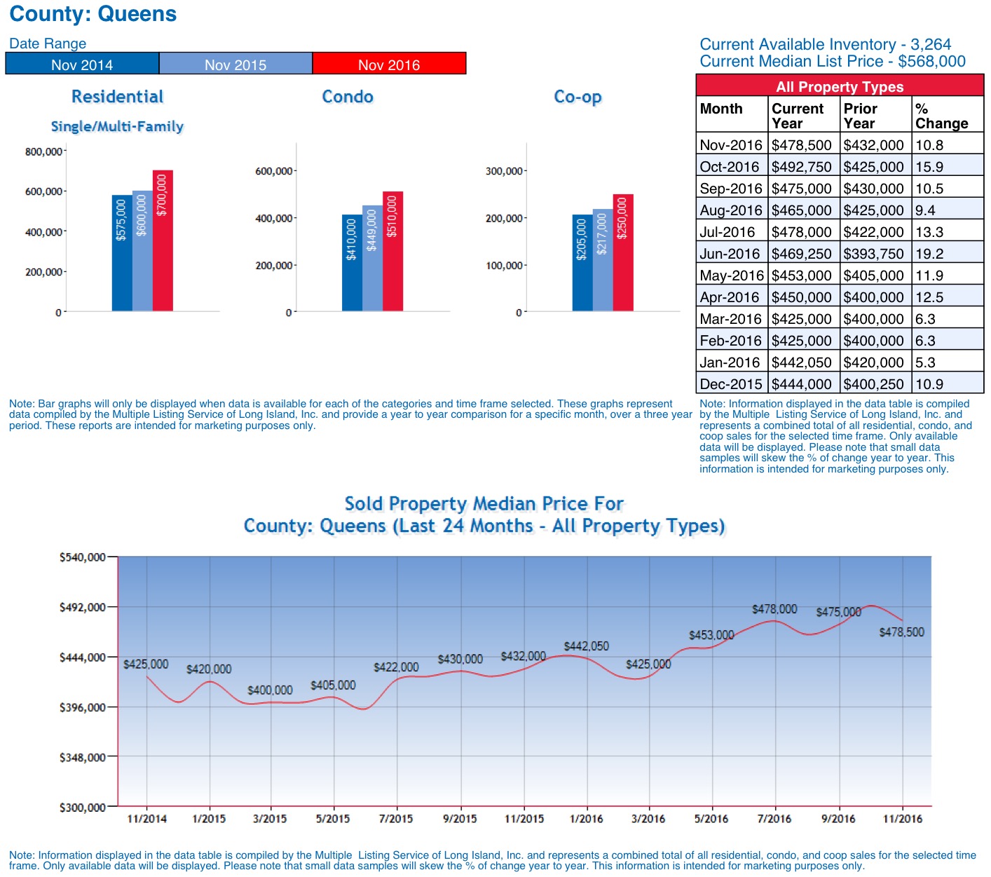 Specifically, Residential 1-3 family Queens home prices were up 16.7%, Queens Condo prices were up 13.6%, and Queens Coop prices were up 15.2% compared to this time last year. Over the last 12 months, Queens home prices are up 10.4%.