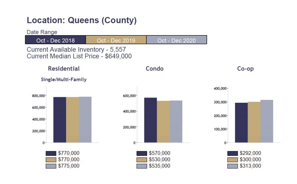 As of December 31, 2020, the median home price in Queens was $650,000, this is UP 9.9% from the previous quarter, and UP 7.9% compared to the same quarter of last year. Specifically, the median home price for Residential homes was UP .6%, median home price for condos was UP .9%, and the median price for coops was UP 1% compared to the same quarter last year.