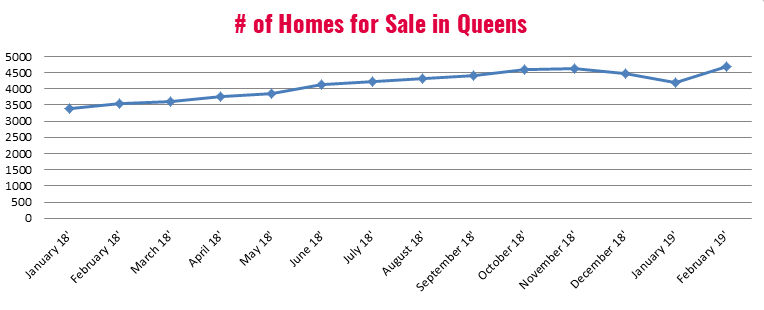There is currently a 6.3-month supply of housing inventory in Queens, this is up from the 6.1-month supply we had last month, and up from the 4.5 month’s supply we had in January of last year. As for active listings for sale, currently there are 4,691 homes for sale in Queens. That’s DOWN 3.6% from December and UP 28.6% compared to January of last year. To put that into perspective, last year at this time there were a total of 3,649 homes for sale in Queens.