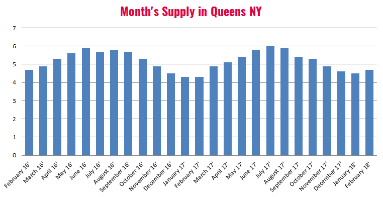There is currently a 4.7-month supply of housing inventory in Queens, this is up from the 4.5-month supply we had last month, and up from the 4.3 month supply we had in February 2017. The number of homes currently for sale in Queens NY is 3,531. This is an increase of 3.7 percent compared to last month, and an increase of 9.8% compared to February of last year when there were 3,217 homes for sale in Queens.