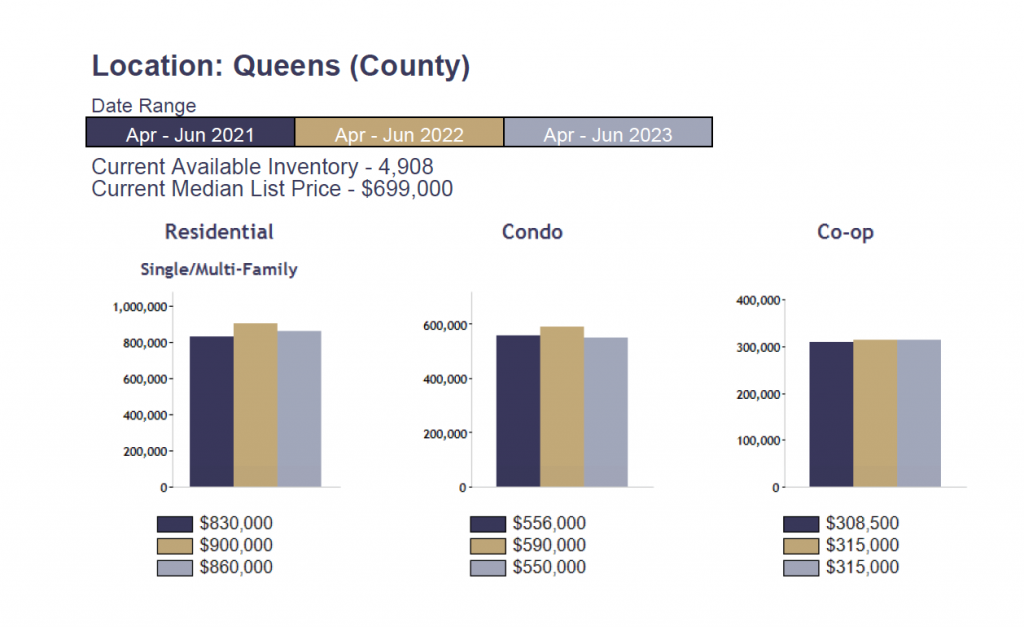 Data Source: https://www.queenshometeam.com/wp-content/uploads/2023/07/Queens-Real-Estate-Market-Report_Q2_2023.pdf
