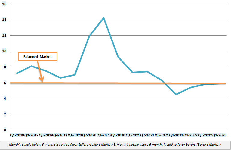 Months of supply is a good indicator of whether a particular real estate market is favoring buyers or sellers. Typically, a market that favors sellers has less than 6 months of supply, while more than 6 months of supply indicates an excess of homes for sale that favors buyers.