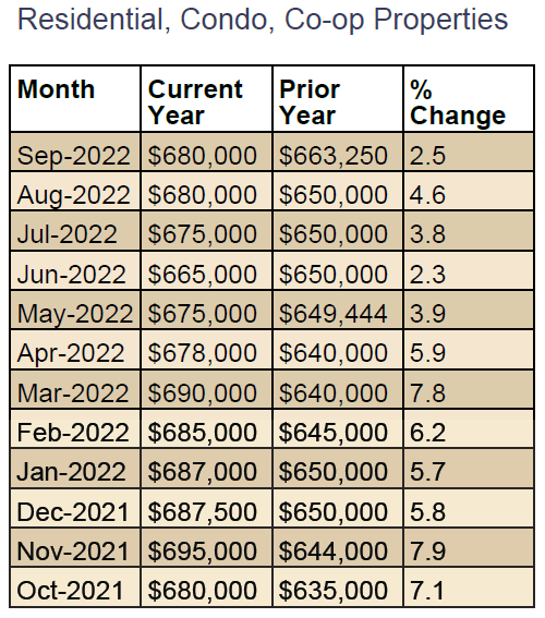 At the end of Q3 2022, the median home price in Queens was $680,000, that’s UP 2.3% from the previous quarter, and UP 2.5% compared to the same quarter of last year. Specifically, the median home price for residential homes was UP 5.7%, median home price for condos was DOWN 1.6%, and the median price for coops was UP .6% compared to the same quarter last year.