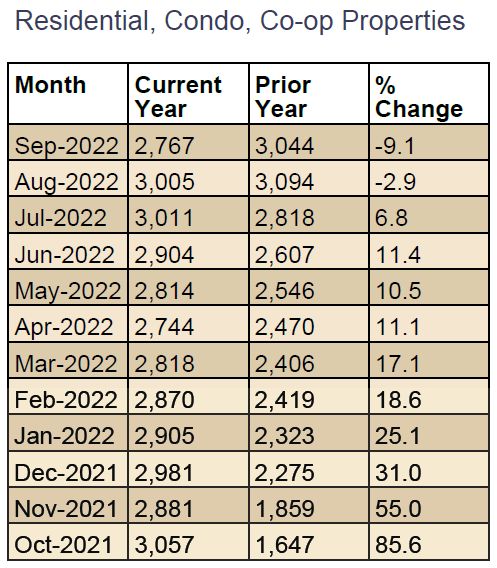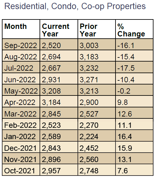 The One Key MLS reported a total of 2,767 closed home sales during the 3rd quarter of 2022. This was DOWN 4.7% from the previous quarter and DOWN 9.1% compared to the same quarter last year. Specifically, sales for Residential homes were DOWN 12.9%, Condo sales were DOWN 11.8%, and Coop sales were DOWN 1.1% compared to the same quarter last year.