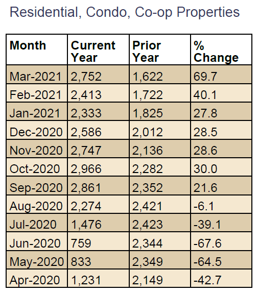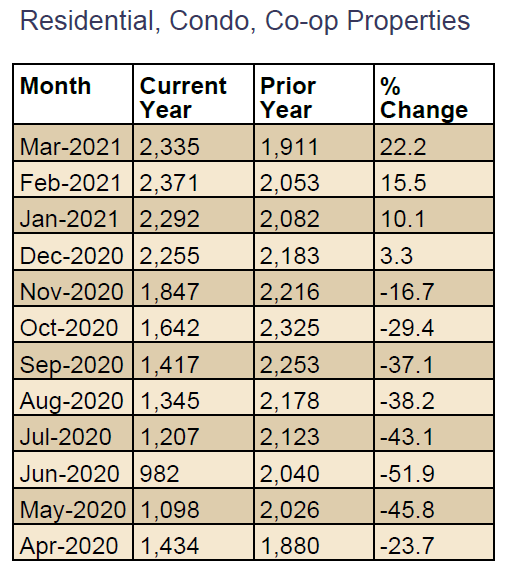 The One Key MLS reported a total of 2,335 closed home sales during the first quarter of 2021. This was DOWN 1.5% from the previous quarter and UP 22.2% when compared to the same quarter last year. Specifically, sales for Residential homes were UP 18.3%, Condo sales were UP 15.1%, and Coop sales were UP 33.2% compared to the same quarter last year.