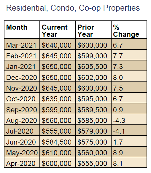 At the end of Q1 2021, the median home price in Queens was $640,000, this is DOWN .8% from the previous quarter, and UP 6.7% compared to the same quarter of last year. Specifically, the median home price for Residential homes was UP 6.7%, median home price for condos was DOWN 1.9%, and the median price for coops was UP 2.2% compared to the same quarter last year.