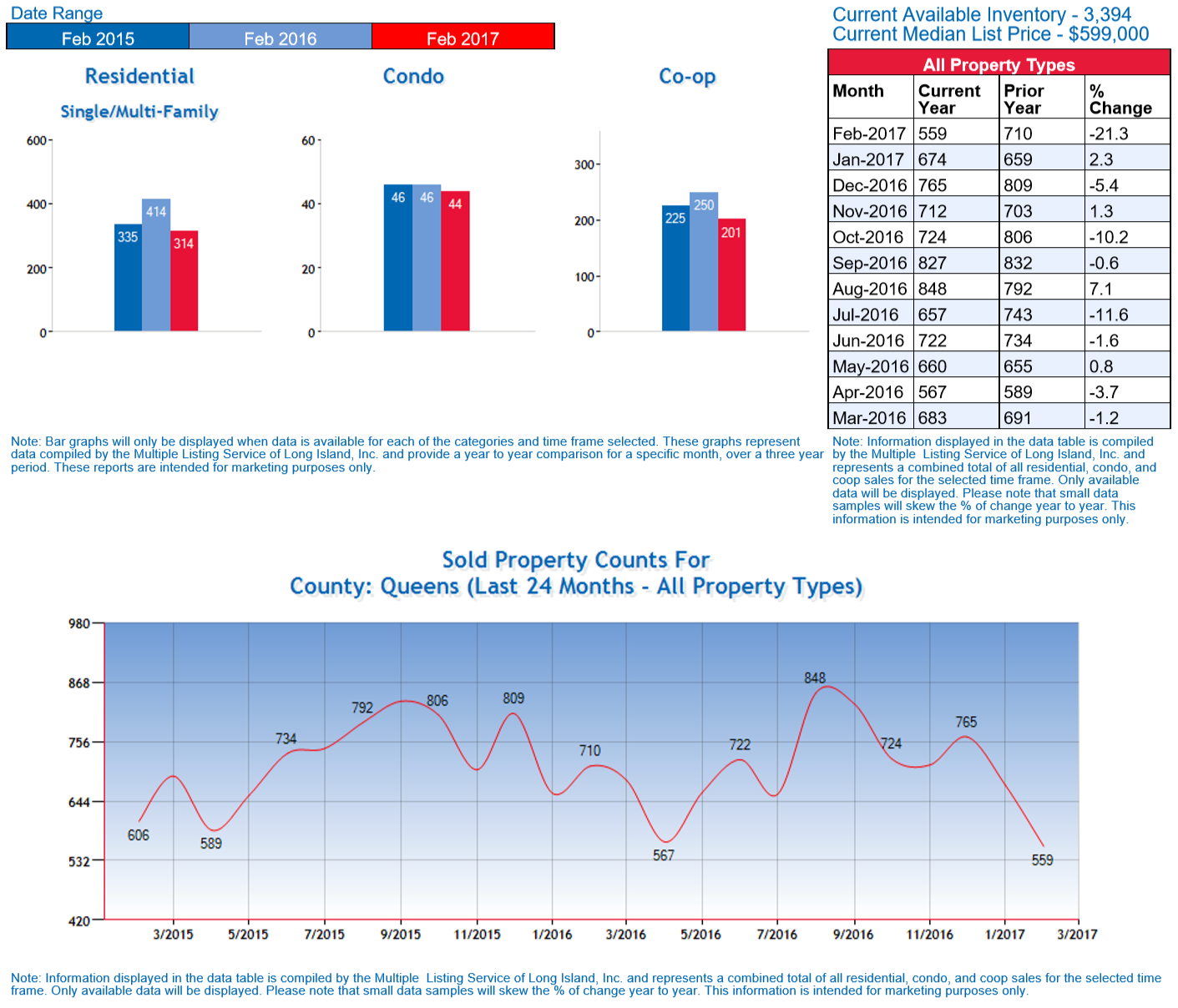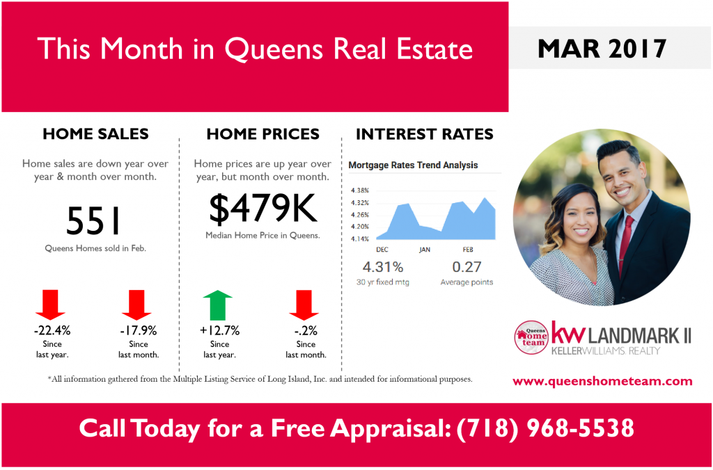 The Long Island Board of REALTORS® reported Queens median home price of $475,000 in February, this was down 1 percent from January but still up 11.8 percent from February of last year.