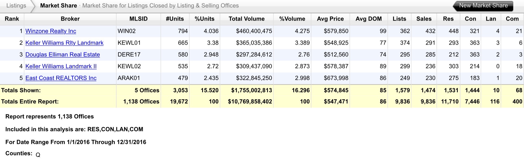 Based on 2016 numbers, Winzone had the highest volume, East Coast Realtors had the highest average sale price, and Elliman had the lowest average days on market.